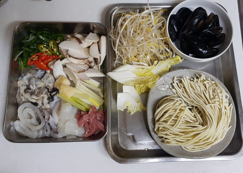 사골육수 4컵 생면 250g 홍합150g (깨끗하게 손질)